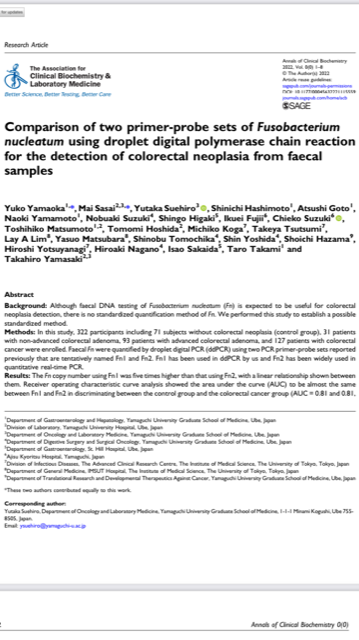 PubMed論掲載報告~Annals of Clinical Biochemistry誌:筆頭著者 山岡祐子先生~